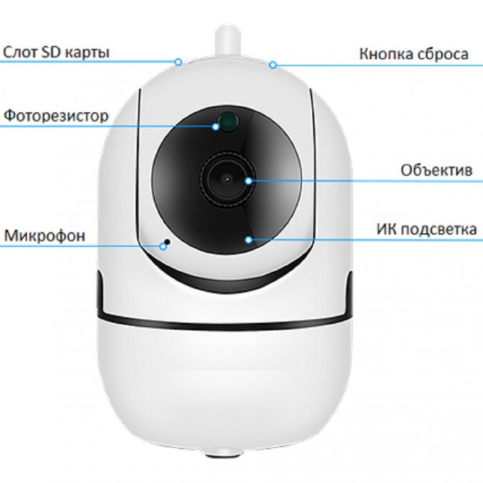 Видеокамера Wi-Fi купольная наклонно - поворотная с ИК подсветкой двухмегапиксельная, 1920х1080, 1/2.7” сенсор 0.1 Люкс (день) 0 Люкс (ночь с ИК подсветкой), автоматическое слежение за движущимися объектами, детектор движения, встроенный микрофон / встроенный динамик, поддержка microSD карт, облачное хранение, мобильное приложение для iPhone, Android, веб интерфейс отсутствует. Питание DC 5В microUSB, ИК подсветка 5-10 м, -0+50˚C.